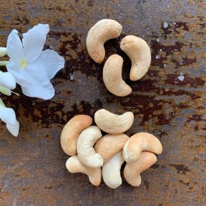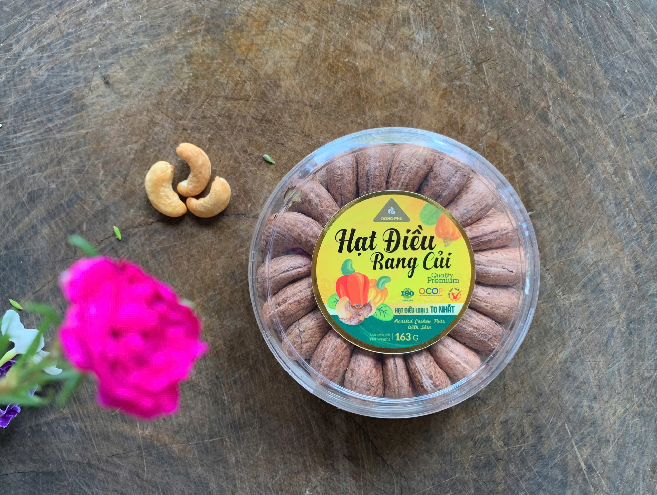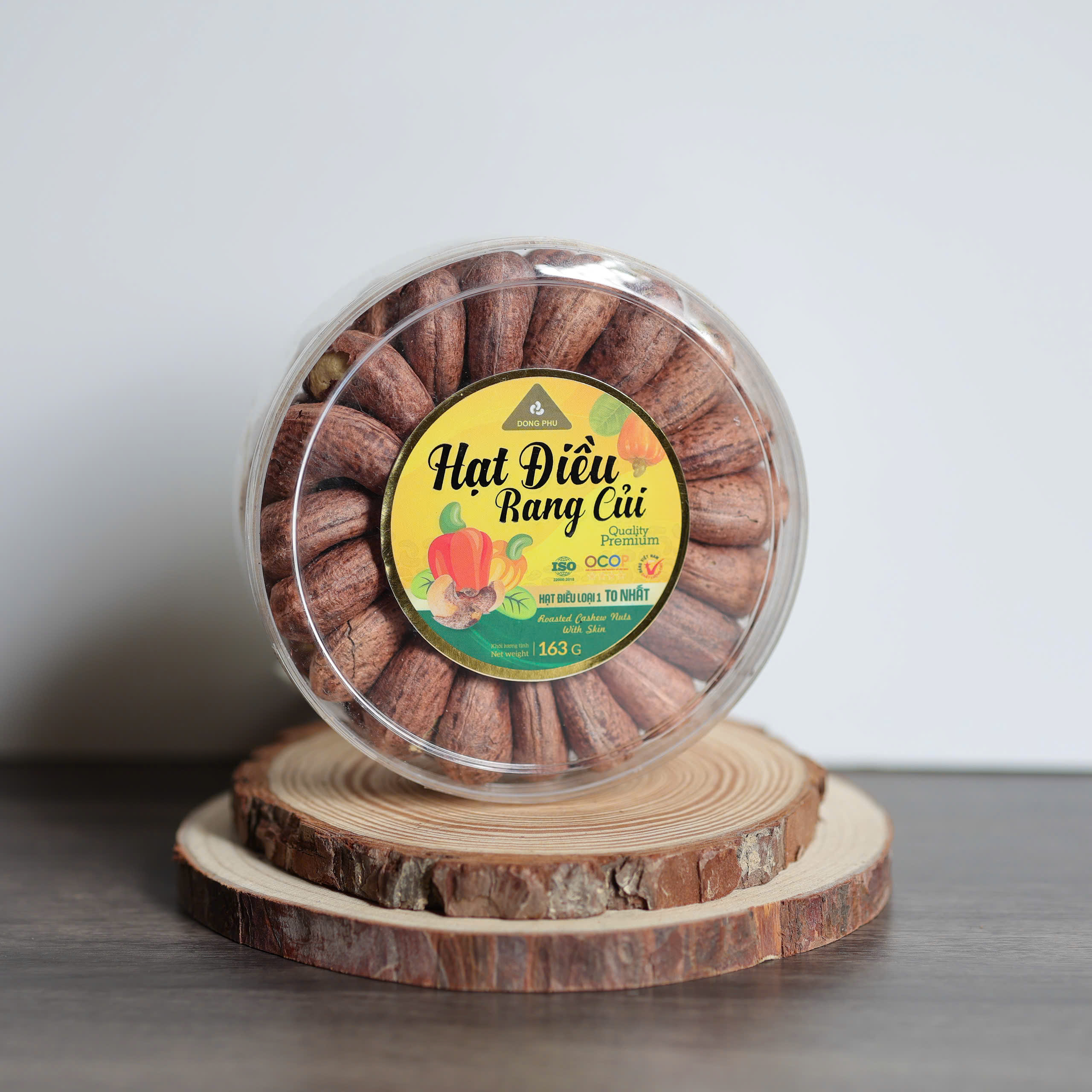 - Tên gọi: Hạt điều rang củi còn vỏ lụa – hộp tròn xếp hoa 163g