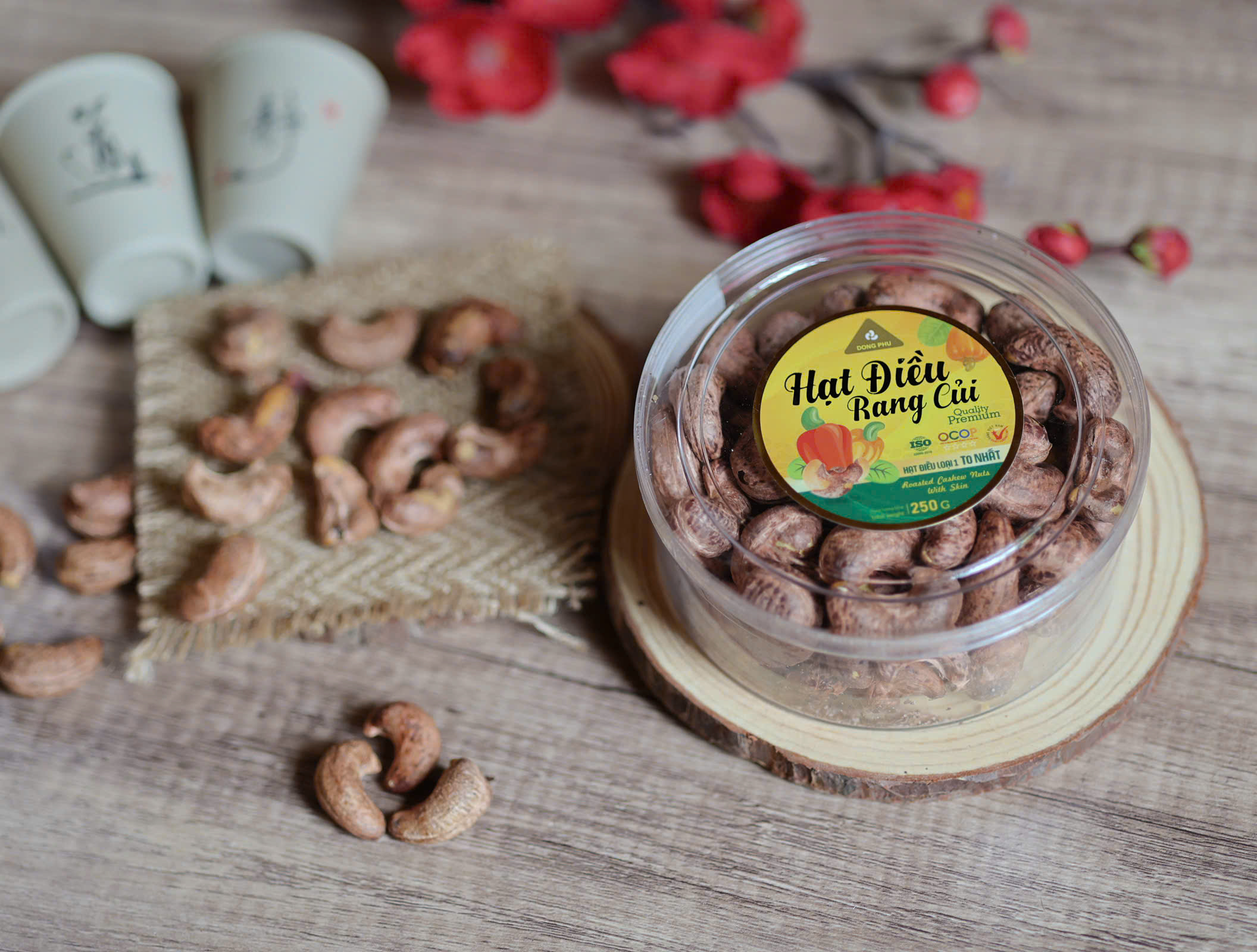 - Tên gọi: Hạt điều rang củi hộp tròn 250g – không xếp