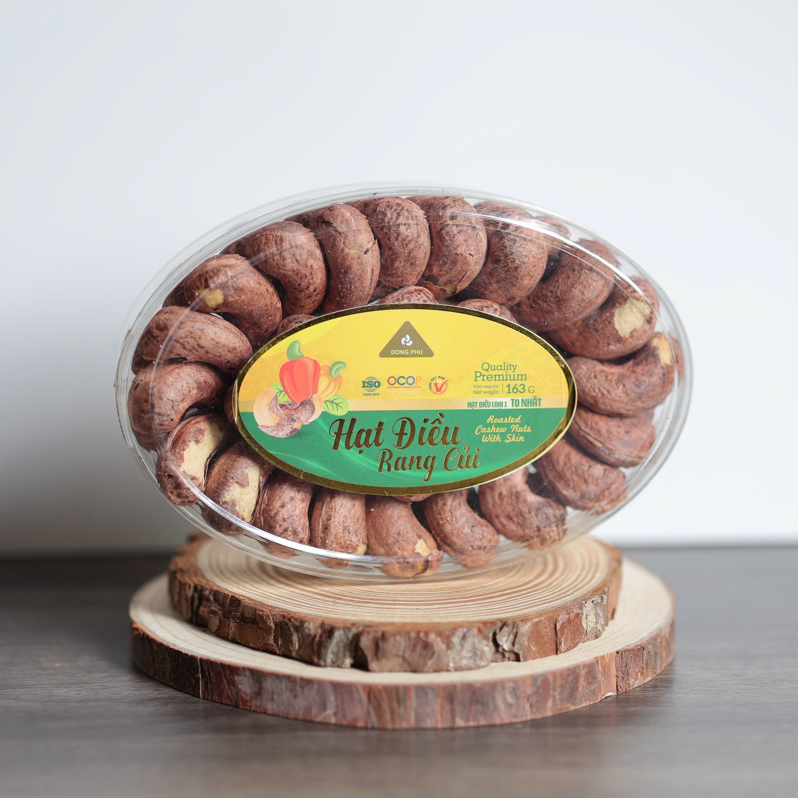 1. Tên gọi: Hạt điều rang củi còn vỏ lụa – hộp elip xếp hoa 163g